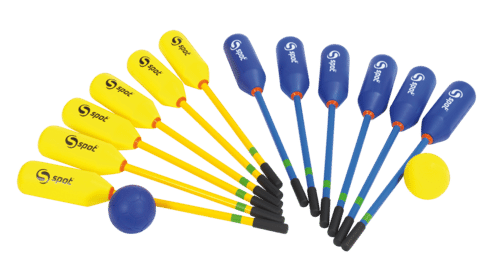 - 12 bouncers (6 geel en 6 blauw) en 2 ballen.