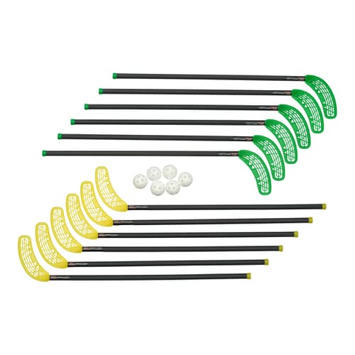 - Set bestaat uit 12 sticks (6 met geel slagblad en 6 met groen slagblad) en 6 gatenballen van 7 cm.