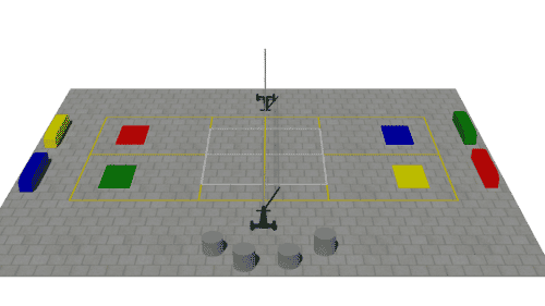 - Het spelveld is voorzien van belijning, gekleurde vlakken en is verrijkt met betonelementen.
