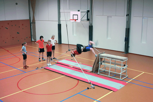 - Afgespannen naar de draaibare tuibevestiging in de vloer ontstaat een zeer stabiele rekstokinstallatie, geschikt voor schoolgebruik en training op verenigingsniveau.