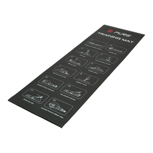 - Oprolbare oefenmat voorzien van afbeeldingen van 12 basisoefeningen in twee categorieën.