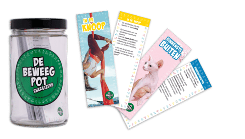 - Dat is handig; een pot vol met beweegkaarten. Kaartje pakken en de activiteit kan gedaan worden.
