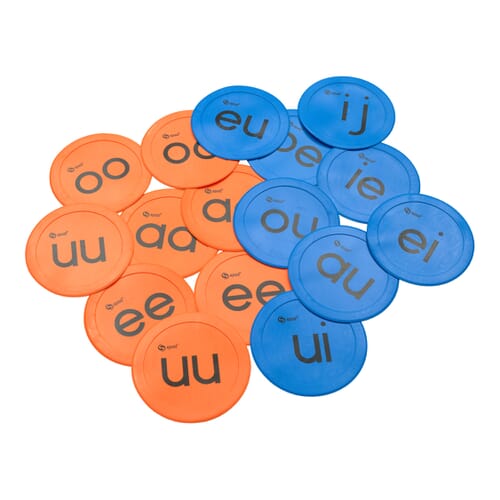 Markeerschijven met blokletters van lange- en twee-teken-klanken, ideaal voor bewegend leren activiteiten. Ook om samen met de alfabet markeerschijven woorden te leggen. Prima te combineren met de move cube en insteekkaartensets. De lange klanken staan op de gele markeerschijf, de twee-teken-klangen op de blauwe. De TPE markeerschijf heeft een diameter van 22 cm en heeft een goede antislip werking. De opdruk in zwart is goed contrasterend met de gekleurde schijf. De set bestaat in totaal uit 16 schijven. TPE is een rubbersoort die 100% recyclebaar is.