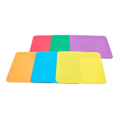 Deze vierkante markeerschijven zijn goed zichtbaar en ideaal als honk, vrijplaats in een tikspel of als aanduiding van een station in een circuit. De set bestaat uit 6 vierkante schijven in 6 verschillende kleuren. Deze antislip vinyl markering heeft afmeting van (l x b) 31 x 31 cm.