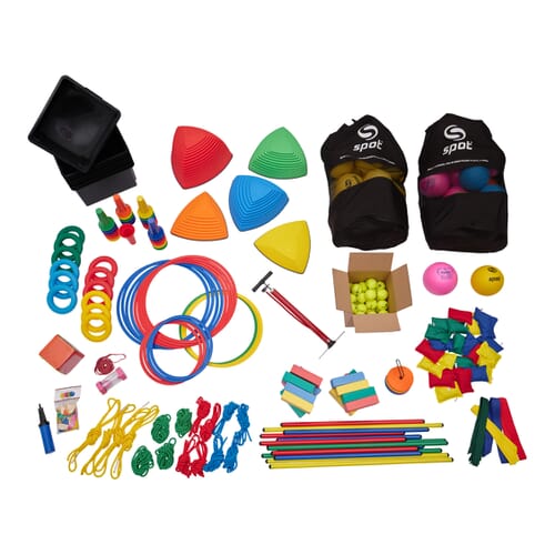 144-delig spelpakket bestaande uit de meest gebruikte spelmaterialen in het speellokaal. Genoeg materiaal voor een gevarieerde spelles in vakken of stroomvorm. Set bevat o.a. pittenzakken, hoepels, stokken, springtouwen, spelblokken, werpringen, springelastiek, tennisballen, spelballen, move cube, markeerschijven, zandloper, partijlinten, ballonnen en balansmateriaal. Per product zitten meerder kleuren in de set, dat is makkelijk bij groeps- of vakindeling en voor het (ongemerkt) oefenen van kleurherkenning. Set wordt compleet geleverd met pompen, ballentassen en opbergkratten. Ruim 10% korting op de standaard prijs.