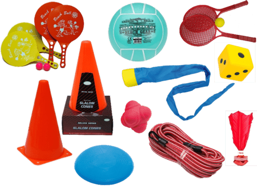 10-delig sportpakket bestaande uit o.a. pilonnen voor veldmarkering, tennisset, beachballset, frisbee, staartbal, fhuttel, frisbee, toverkoord om een lijn te maken en dobbelsteen om team te vormen.