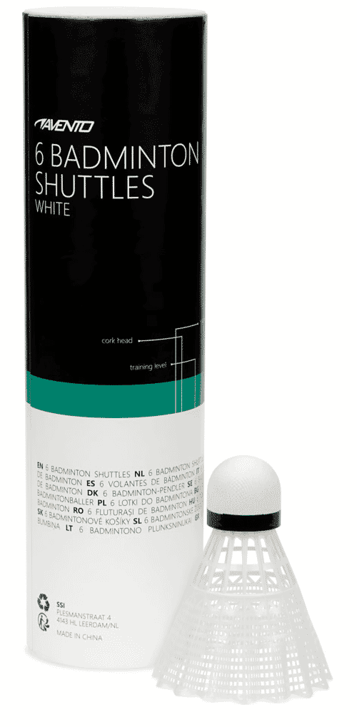 Prima nylon shuttle, voor onderwijs en training. De dubbele nylon veren rok en kurken dop zorgen voor stabiele vlucht.. Medium snel. Koker met 6 shuttles. Kleur wit.