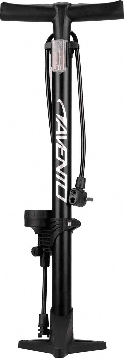 Stevige pomp met manometer. De slang heeft een dubbele pompkop met locksysteem voor verschillende nippels. Bij de pomp zitten 3 verschillende opzetstukken/nippels. Hoge drukcapaciteit tot 11 bar/160 PSI. Afmeting ca. 60 x 22 x 16 cm.