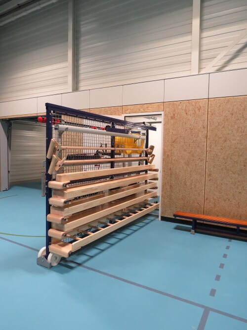 - Geschikt voor opbergen van 3 bankbladen, 1 evenwichtsbalk, 1 ladder, 4 Trapezestokken, 1 dubbele koppelbuis, 2 Ophangframes, 2 Touwladders, 8 Turnringen, 6 Spankoorden en 4 Verlenghijsbanden.