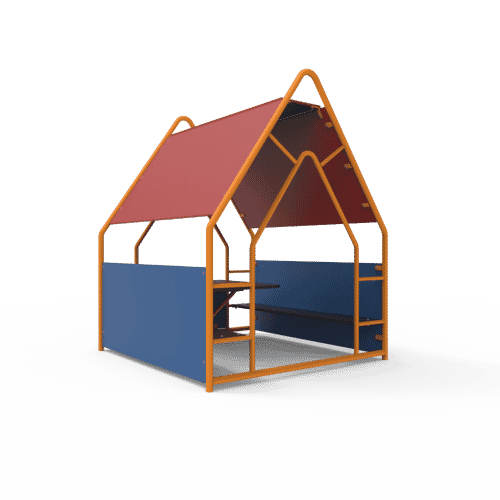 - Een kleurig speelhuis met ruime zitplekken en een tafel.