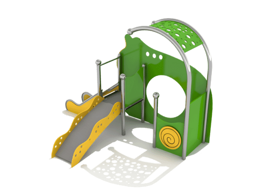- Speeltoestel met aan de zijkant een grote afbeelding van een slak en in de constructie stijlkenmerken die verwijzen naar de vormen van de slak.