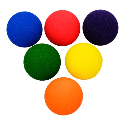 High bounce foambal, inzetbaar bij slagspelen in een kleine ruimte. Bal wordt. Door het lage gewicht, niet ver weg geslagen. Door de open structuur goed indrukbaar en daarmee ook geschikt voor druk- en knijpoefeningen. De kleurcoating gaat stuiven tegen waardoor bal ook gebruikt kan worden door deelnemers die last van astma hebben. Set in 6 verschillende kleuren.